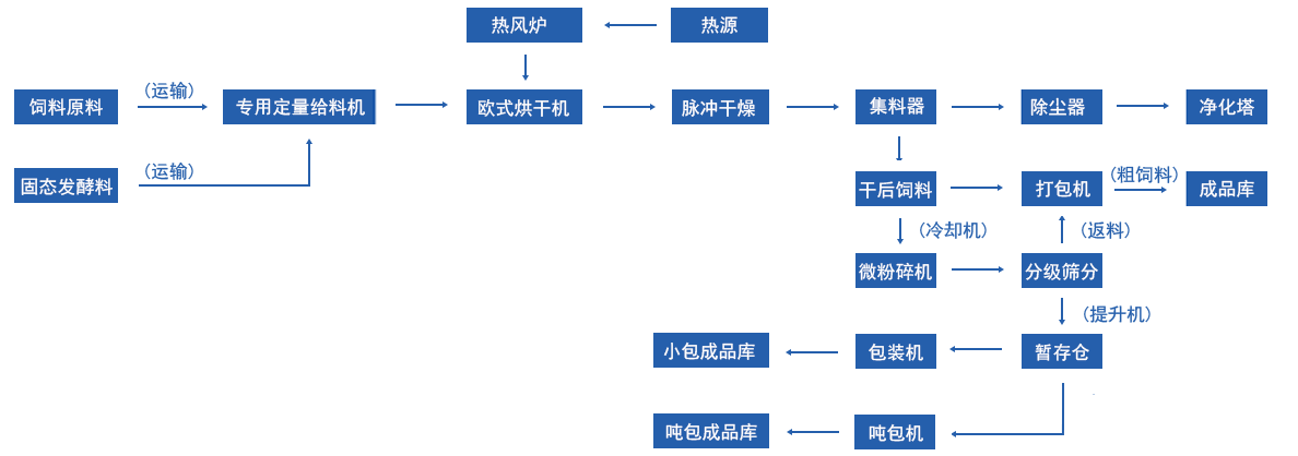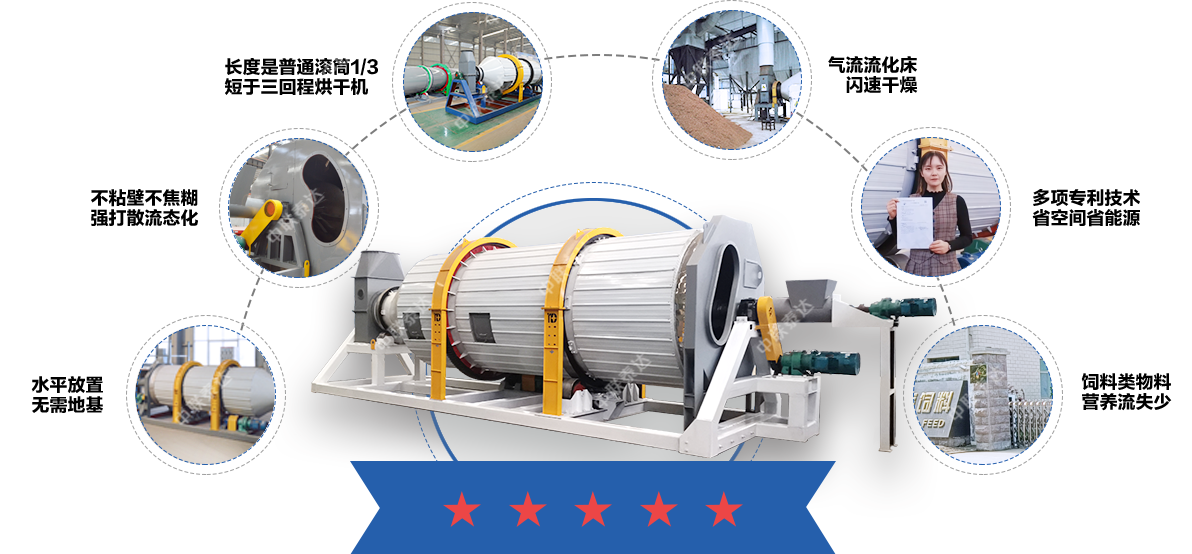 7个型号,处理能力0.8-15t/h,可烘干含水率30-80%区间的饲料原料